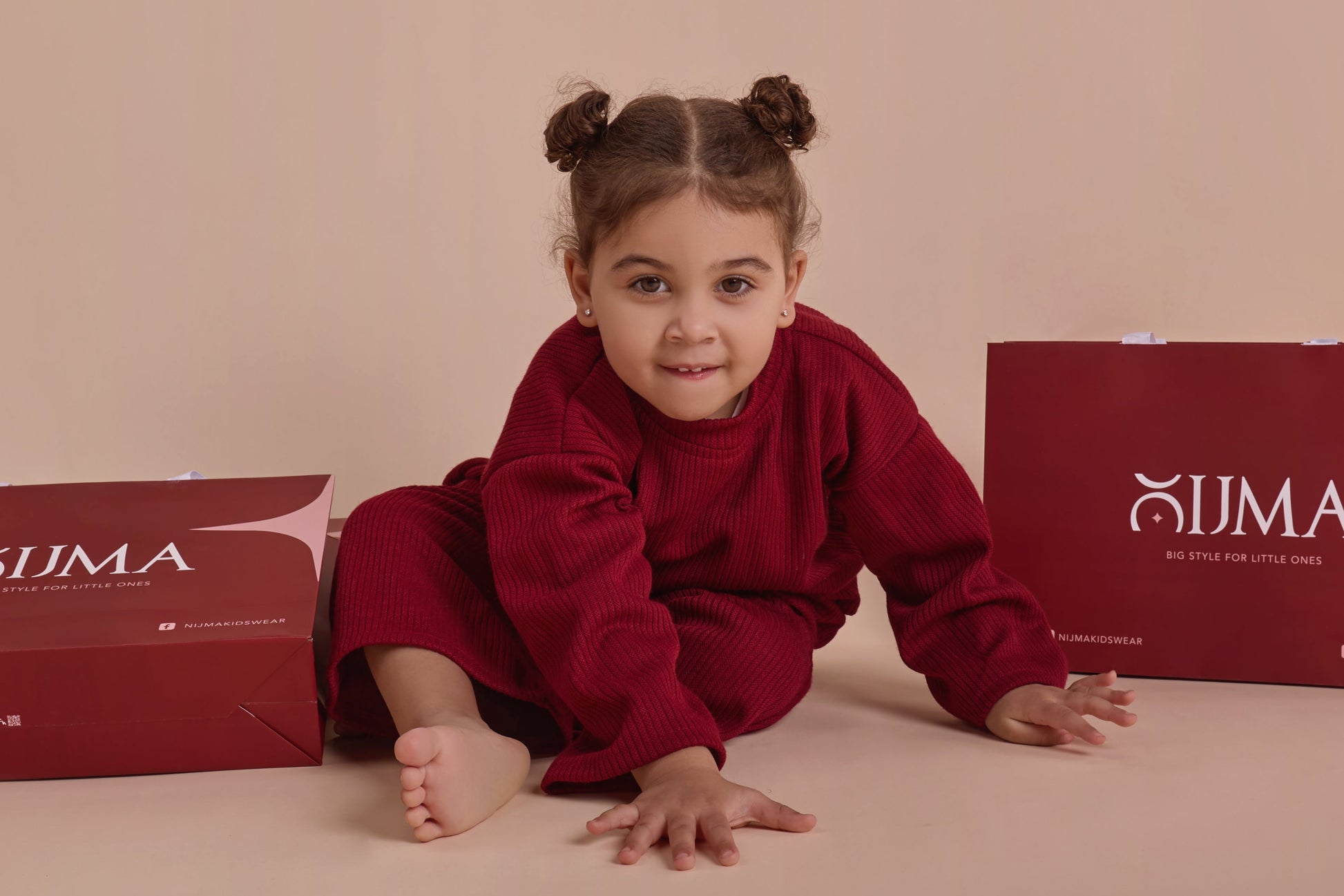 The Crimson Spark Set from Nijma's Starlight Debut Collection is made from soft, ribbed fabric, offering a perfect blend of comfort and style. Its vibrant crimson color adds a bold, trendy flair, making it ideal for both playdates and special occasions. Designed for versatility, this set ensures your little star shines bright wherever they go.