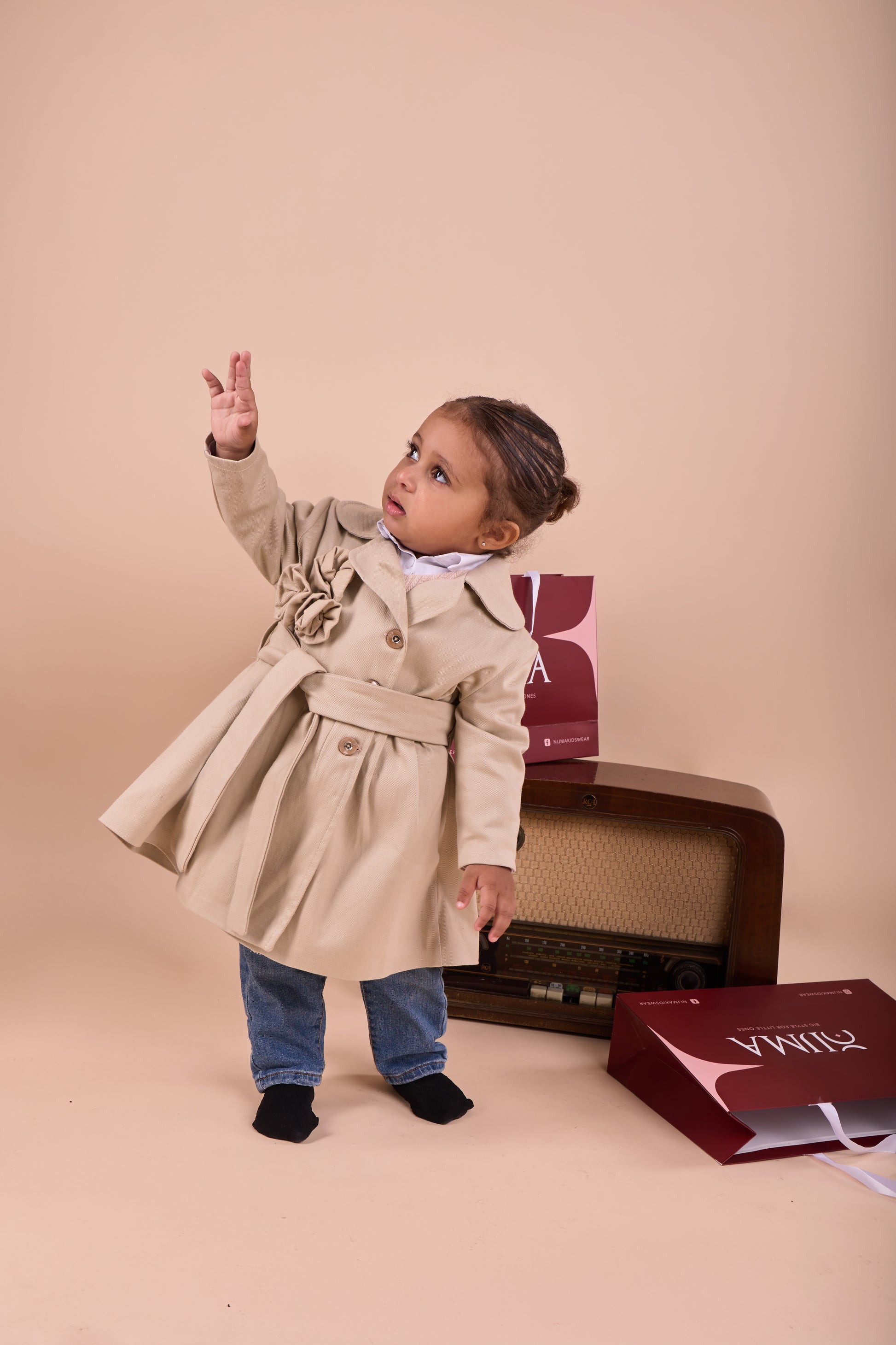 The Floral Dream Coat from Nijma's Starlight Debut Collection is an elegant beige design featuring three delicate flowers on the right chest. This timeless piece combines charm and sophistication, making it the perfect addition to your little star’s wardrobe for special occasions or everyday elegance.
